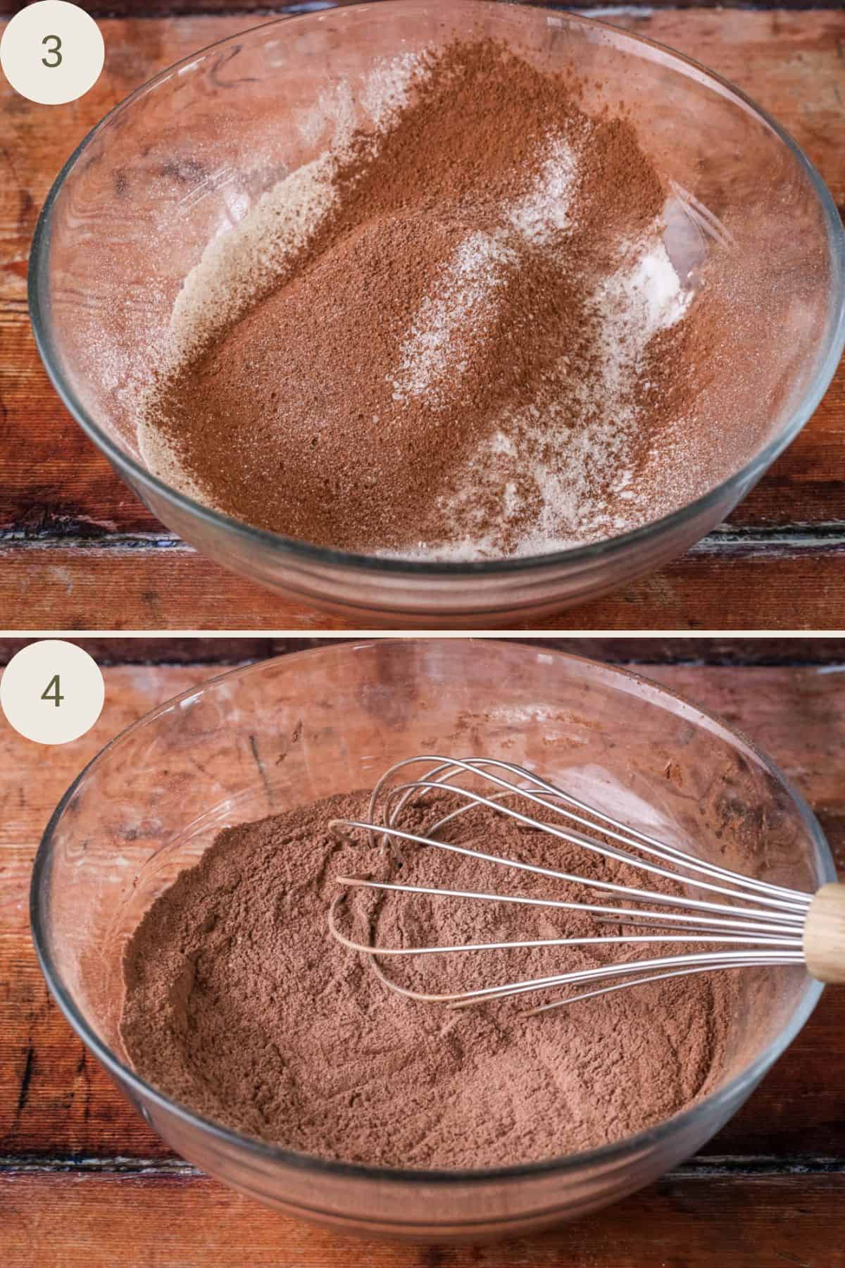 4. Sift together the flour, cocoa, bicarbonate of soda, baking powder and salt in a medium sized mixing bowl then set aside.
