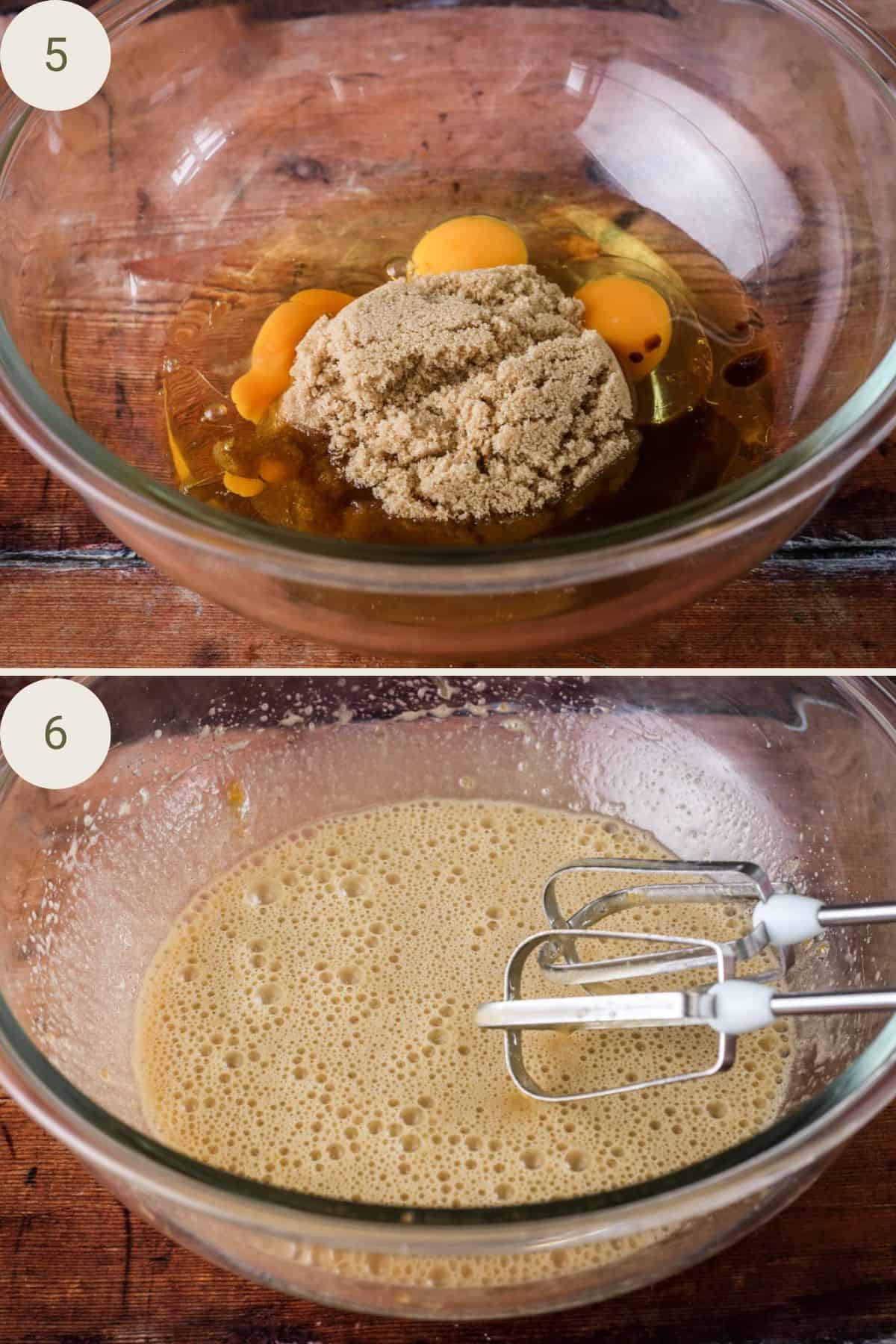 5. Break the eggs into a large mixing bowl and add in the brown sugar, olive oil and vanilla extract. Whisk together until smooth.