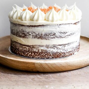 This Gluten-Free Carrot Layer Cake has been decorated in the 'Naked' style. Which means that only a very thin layer of buttercream is used to cover the outside layers of the cake. This is a very achievable look and is perfect if you don't decorate layer cakes very often as it's very forgiving. Here are a couple of tips to help you with your Naked Carrot Cake: