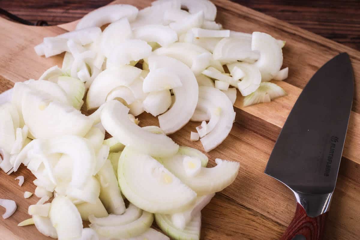 Onions. I recommend using white onions (sometimes called yellow onions or Spanish onions). The caramelised flavour is just right with these onions. I did test the recipe with red onions and I found the results too sweet.