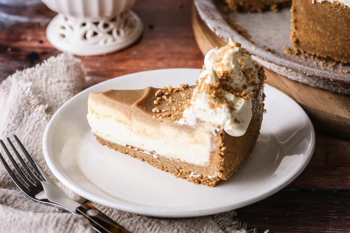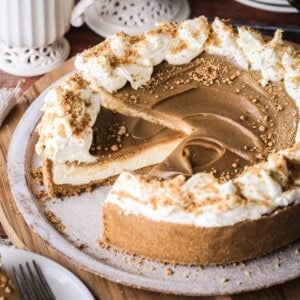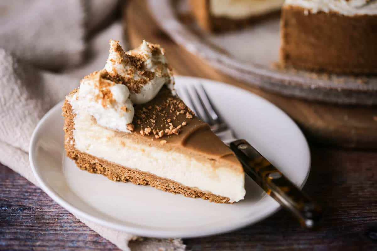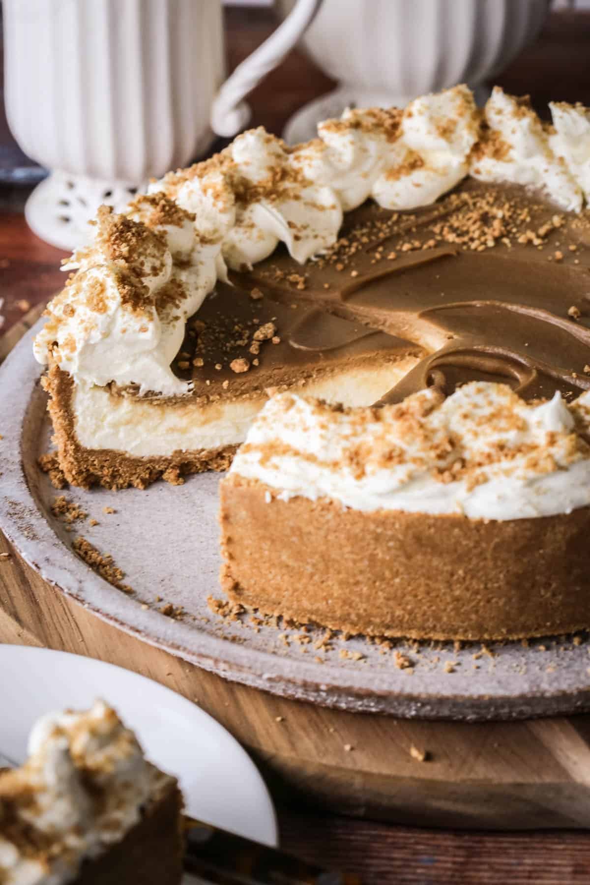 I suggest once you have added the toffee sauce then to chill your cheesecake overnight before finishing with the double cream topping and biscuit crumbs. This way you can get really smooth and clean slices when you are serving as the cheesecake will have fully set.